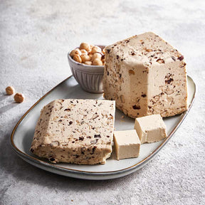 حلاوة طحينية بالبندق - سوريا ماركت - من السكريات المعروفة وهي في الأصل عبارة عن خليط من طحين السمسم والسكر ، ويمكن إضافة المكسرات أو الفواكة المجففة إليها . تعرف الحلاوة الطحينية في جميع أنحاء العالم باختلاف مسمياتها فمصر والشام يطلقون عليها الحلاوة الطحينية أما المغرب فيطلقون عليها الحلوى الشامية ، ويطلق عليها دول الخليج بالرهش .