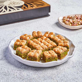 آسية فستق – حلا شرقي شامي! حلو شرقي راقي معمول على الطريقة السورية الأصلية، طعمة أيام زمان اللي كلنا متعودين عليها! عجينة بقلاوة مقرمشة، محشية بأجود أنواع الفستق الحلبي، وملفوفة بإتقان لتعطيك شكل أنيق وطعم غني، ومخبوزة بأجود أنواع السمن البلدي، ومسقاية بالقطر لتعطيك توازن مثالي بين القرمشة والطراوة، بتضيف لمسة فخامة لكل مناسبة.