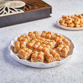 آسيا كاجو - لمسة من أصالة الحلو الشامي! عجينة بقلاوة ذهبية مقرمشة، معمولة على الطريقة السورية الأصلية، محشية بقطع الكاجو الفاخرة اللي بتمنحها طعم ناعم وفخم. كل قطعة مخبوزة بأجود أنواع السمن البلدي ومسقاية بقطر لطيف، لتعطيك تجربة ما بين القرمشة الذهبية وطراوة الحشوة. طعمها رح يذكرك بأيام زمان، مناسبة لتحلية شهر رمضان المبارك.