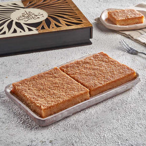 بسبوسة سادة – الطعم الأصلي اللي كلنا منعرفه! حلو شرقي راقي معمول على الطريقة السورية الأصلية، طعمة أيام زمان اللي كلنا متعودين عليها! بسبوسة طرية وغنية بالسمن البلدي الأصلي، مسقاية بالقطر لتكون حلاوتها متوازنة وقوامها يذوب بالتم، مناسبة لعشاق الطعم الكلاسيكي، وبتضيف لمسة فخامة لكل مناسبة، وتحلية مثالية لشهر رمضان المبارك.