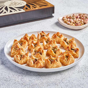بقج فستق حب – الطعم الفاخر بقوامه المميز! حلو شرقي راقي معمول على الطريقة السورية الأصلية، طعمة أيام زمان اللي كلنا متعودين عليها! عجينة بقلاوة مقرمشة محشية بحبات الفستق الحلبي الكاملة، ملفوفة بإتقان بشكل البقجة لتكون تحفة فنية شهية، ومخبوزة بالسمن البلدي الأصلي، ومسقاية بالقطر، بتضيف لمسة فخامة لكل مناسبة، وتحلية مثالية لشهر رمضان المبارك.