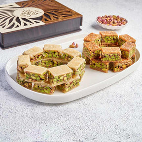 بلورية بيضاء – الفخامة بقوامها الحريري! حلو شرقي راقي معمول على الطريقة السورية الأصلية، طعمة أيام زمان اللي كلنا متعودين عليها! عجينة كنافة ناعمة، محشية بأجود أنواع الفستق الحلبي، ومخبوزة بالسمن البلدي الأصلي لتعطيها طعم غني، مسقاية بالقطر الخفيف مع الماء زهر لتعطيك الحلاوة المتوازنة، بتضيف لمسة فخامة لكل مناسبة، وتحلية مثالية لشهر رمضان المبارك.