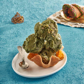 آيس كريم فستق، نكهة الفخامة والطعم الأصيل! محضر من الفستق الحلبي الطبيعي ليعطيك تجربة غنية بقوام كريمي وطعم لا يُقاوم! لمحبي الفستق والطعم الشرقي المميز!