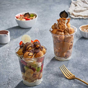 كاس وافل فواكه، تجربة مقرمشة ومنعشة بنفس الوقت! كوب وافل ذهبي ومقرمش معاه قطع فواكه طازجة مع لمسة من العسل أو صوص الشوكولا لتكتمل المتعة! حلا مثالي لمحبي الطعم المتوازن بين القرمشة والانتعاش!