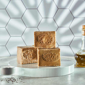 صابون الغار الطبيعي الحلبي الأصلي المصنوع من زيت الزيتون وزيت الغار، بيرطب البشرة، بينظفها بعمق، وبيتركها ناعمة ومنتعشة، مناسب للبشرة والشعر وفروة الرأس.