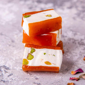 نوجا فستق قمر الدين، النوجا الطرية مع طبقة المشمش الطبيعي أو قمر الدين مع الفستق الحلبي. مثالية لضيافة أنيقة أو لتهادي فيها أصحابك وحبايبك.
