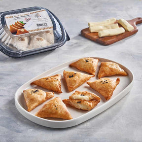 سمبوسك جبنة، من ألذ وأشهر الأكلات السورية! طبق فيه 12 قطعة جاهزين للقلي محشية بألذ جبنة بيضة مذابة، بتقرمش مع أول قضمة وبتسيح الجبنة بقلبك قبل لسانك! عجينة رقيقة ومحشية بكمية جبنة موزونة لتاخد الطعم المثالي، ولون ذهبي بياخد العقل. أساسية في السفرة وخصوصاً سفرة رمضان اللي ما بتكمل إلا بيها! جربها وعيش الطعم السوري الأصيل!