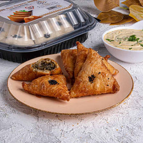 سمبوسك سبانخ، من ألذ وأشهر الأكلات السورية! طبق فيه 12 قطعة جاهزين للقلي، محشية بأطيب سبانخ طازجة ممزوجة بتوابل شامية وسماق بيعطيها نكهة حمضية فريدة. بتقرمش مع أول قضمة، وحشوتها الغنية بتفاجئك! عجينة رقيقة، متوازنة ومقرمشة، ولونها الذهبي بعد القلي بيجنن. أساسية بالسفرة، وخصوصاً سفرة رمضان اللي ما بتكمل إلا بيها! جربها وعيش الطعم السوري الأصيل!