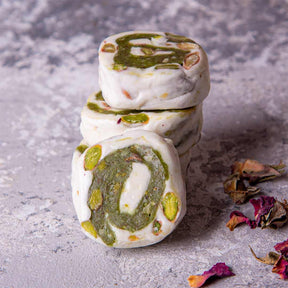 دوّامة فستق، نوجا فاخرة ملفوفة بإتقان مع عجينة الفستق الحلبي، طعم لذيذ ورح يعجبك خصوصاً إذا بتحب النكهات الكلاسيكية، مناسبة للضيافة والهدايا الفاخرة لتهادي فيه أصحابك وحبايبك!